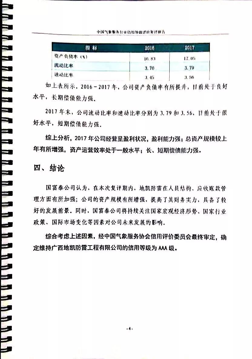 √讲诚信是企业应有的行为规范和应尽的社会责任; √企业信用评级是企业树立形象、提高竞争力、扩大市场的有力武器; √是改进不足,加强管理,提高经营水平的一面镜子; √是教育、警示失信企业的有效形式; √是对自己过去、现在、未来信用行为和信用能力的自信。 之前,中国气象服务协会发布开展2018年行业信用等级评价工作的通知。 “通知”明确,中国气象服务协会与北京国富泰信用管理有限公司合作,开展信用等级评价试点工作,评价有效期三年。该等级评价工作主要针对防雷工程企业和防雷装置检测机构。 2017年10月,中国气象服务协会启动了信用等级评价工作,广西地凯防雷公司等9家协会会员单位成为第一批信用等级试点评价企业,获评AAA或AA级信用企业。 在2018年10月,广西地凯防雷公司再次获评AAA级信用企业。 防雷是一个考验良心的行业,因为无论是防雷产品的研发生产还是工程施工,每一个环节都关系到老百姓的生命财产安全,防雷产品和防雷工程被老百姓接纳并信赖的关键就是一个防雷公司的信誉和实力。 广西地凯防雷公司成立于1989年,起步较早,是国内防雷工程领域产品、技术以及效果可靠安全的企业,在近30年的经营运作过程中赢得了良好的信誉,让老百姓信赖,为老百姓服务。 信誉的获得,是靠不断面市的优质防雷产品,是靠不断完成的优质防雷工程案例和不断增强的实力。信誉的作用,不只是提升品牌形象这么简单,更是一个防雷公司对于行业的尊重,对于老百姓生命财产安全的承诺。 当今社会中各行各业的企业都在为品牌形象做着很多工作,都在为提升信誉而努力,然而,对于防雷工程领域来说,信誉的提升并不仅仅只是为了提升品牌知名度从而提升企业经营效益,更是防雷工程这个良心行业的一种精神和信仰,是防雷工程企业给予老百姓的承诺和安全感。 信誉无法买卖,更不能一蹴而就,信誉需要长期的、耐心的、踏踏实实地去一点一滴的争取,一点一滴地积累。 防雷公司是社会上各领域中容易被忽视却又发挥着极大作用的一个行业,老百姓信赖、选择并最终依靠,是防雷公司最自豪的事情。 广西地凯防雷公司从成立开始,以保护老百姓生命财产安全为己任,诚信经营,生产优质防雷产品,严谨施工,用无数个高效优质的防雷工程案例,积累起值得老百姓信赖,获得无数信誉表彰,用实际行动赢得业内人士的称赞和尊重。 广西地凯防雷公司坚信,信誉是企业发展的关键,更应该是一个防雷公司的信仰。 广西地凯防雷公司成立至今,已经走过了将近三十个春秋,积累了大量的防雷技术和行业经验,欢迎来电咨询,共同推进防雷行业的创新发展。 公司地址:广西南宁市高新区振华路28号 Web:www.dikai.com.cn Email:dikai@dikai.com.cn